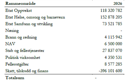 - Investeringsbudsjettet for 2026 vedtas med en total investeringsramme på 62 360 000 kr (inkl. MVA). Samlet låneopptak til finansiering av investering vedtas med inntil kr. 14 000 000.