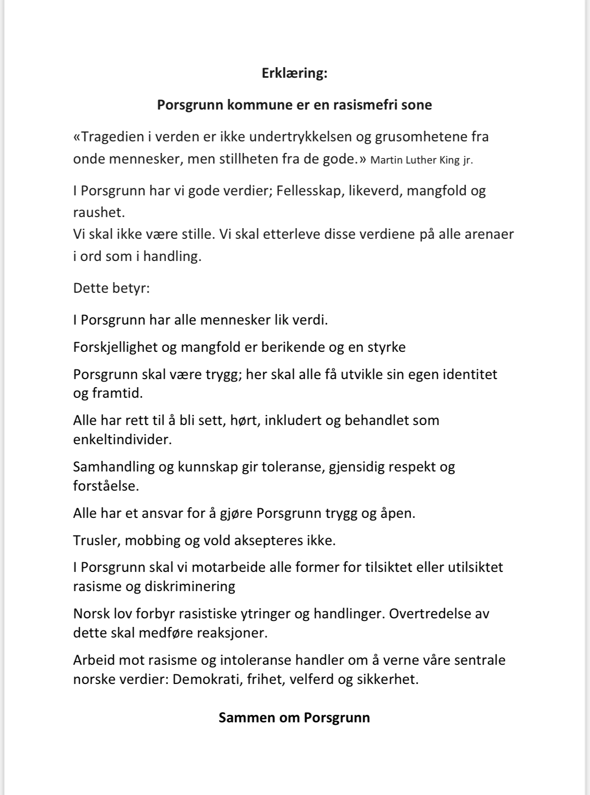 - Flerkulturelt kontaktutvalg har ansvar for å sikre at Porsgrunn kommune følger opp «Erklæring: Porsgrunn kommune er en rasismefri sone».