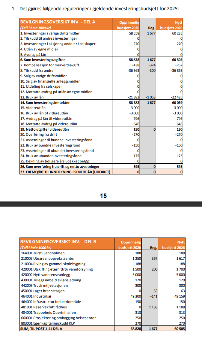 - Årets låneopptak til investeringer i varige driftsmidler som angitt i vedtakspunkt 4.1 i sak 56/25 økes med kr 1 053 000 til kr 22 435 000